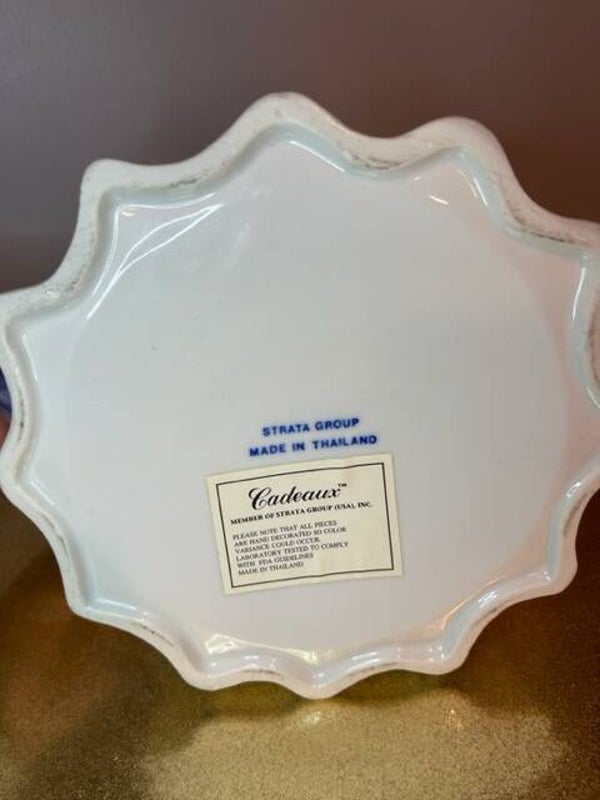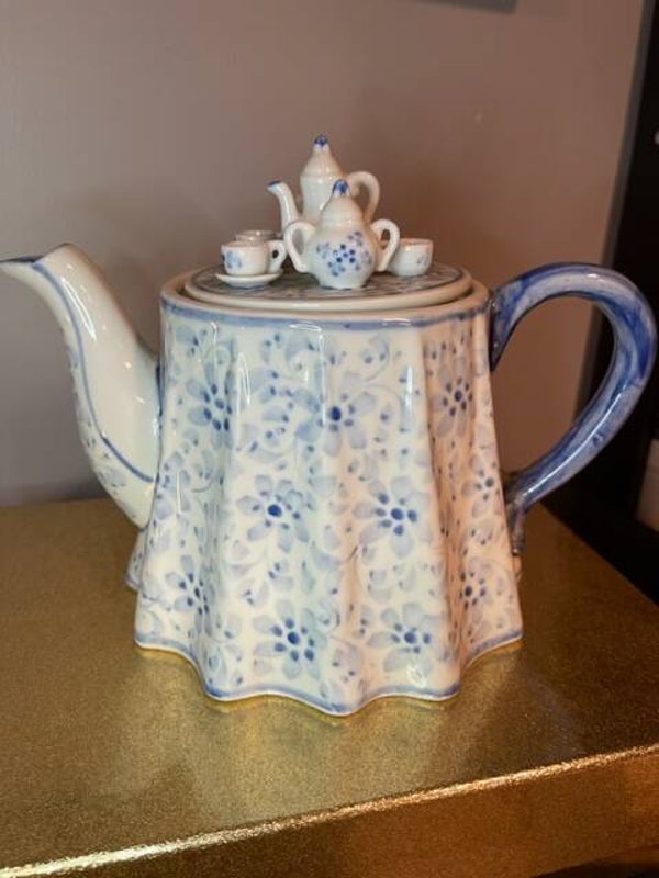 Blue and white vintage tea pot with unique lid. Lid has "mini" tea pots. Shape of tea pot is star. Beatiful!