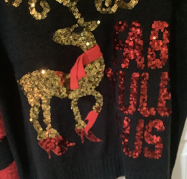 Sweateer has pom poms, reindeer with high heel shoes. It also has the words: FAB YULE OUS