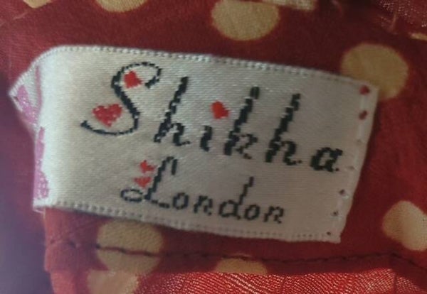 Vintage Red with white dots dress. Knew length with ruffles in front. Long sleeves and stretchy waist. Shikka London brand.