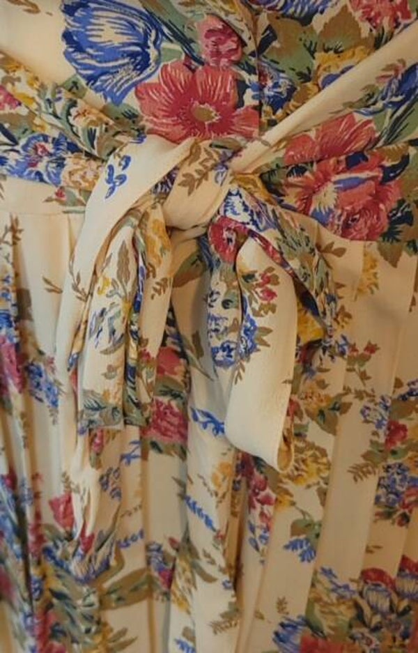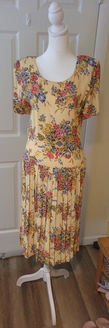 Yellow floral vintage dress size 8 Talbots. Pleated skirt and bow at the back. Short sleeve. 14 1/2 inches across chest. 15 1/2 from neck to waist. Dress is 42 inches long.
