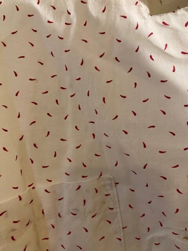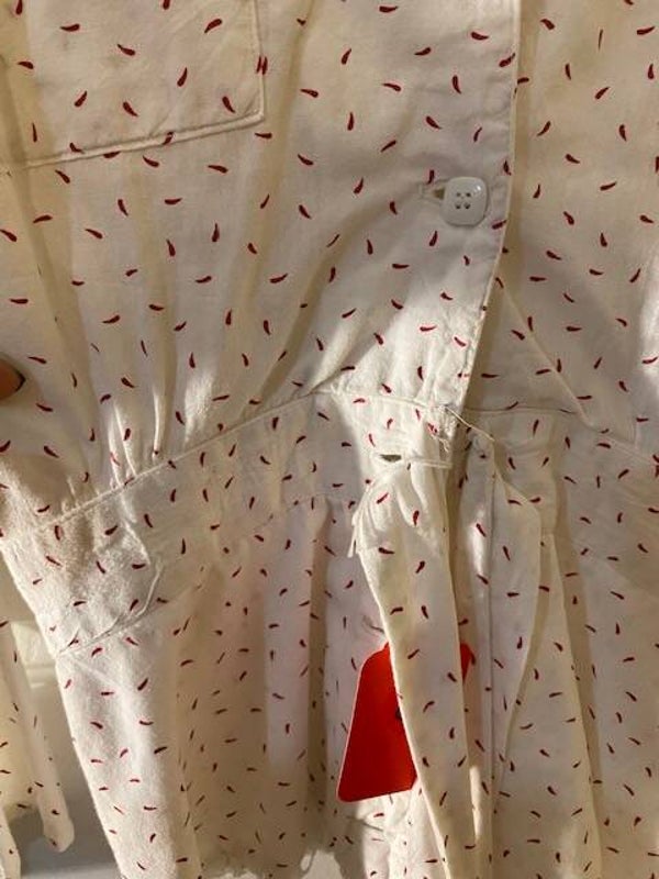 Long sleeve red and white button top. 100% cotton. Tie up waist. Front pockets. Size Small