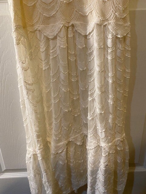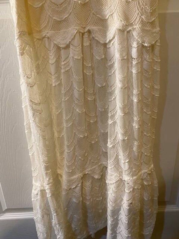 White lace long dress with v neck. 52 inches long. Neckline to waist is 15 inches and it measures 17 inches across.