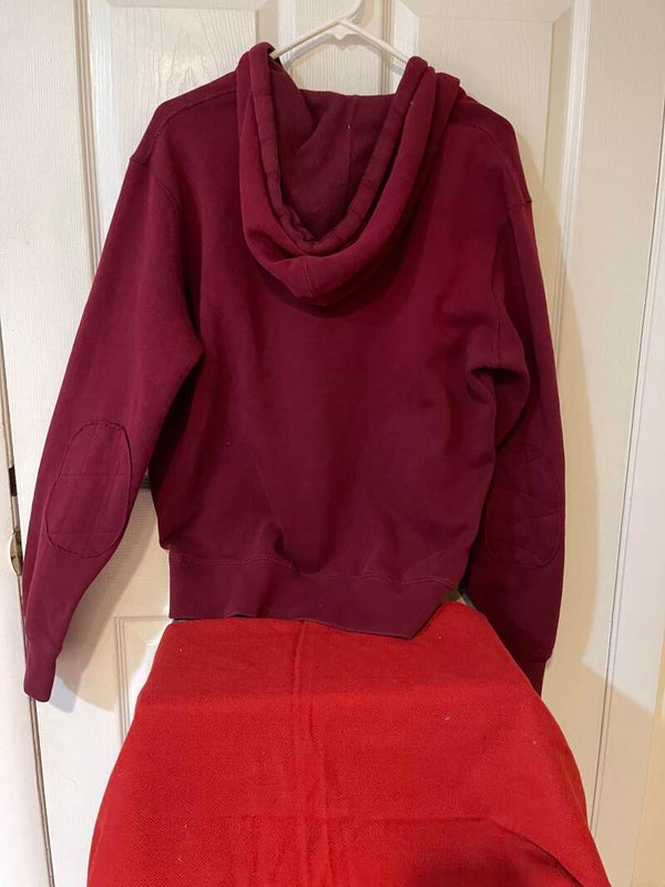 Size medium red polo sweater. Long sleeve with hood. White pull strings.
