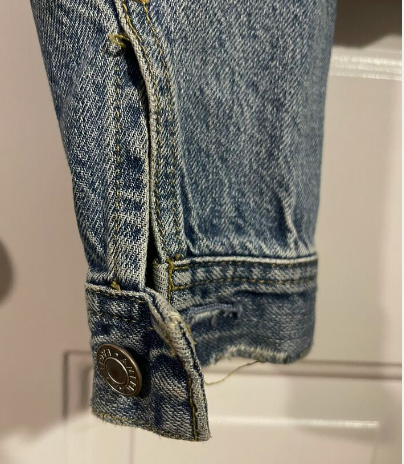 Size small Jean Jacket, medium denim blue. 2 inner pockets. Distressed