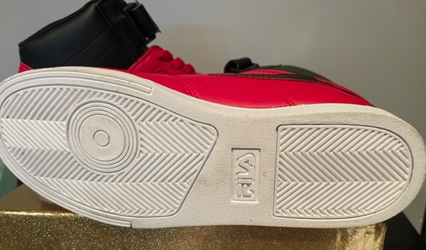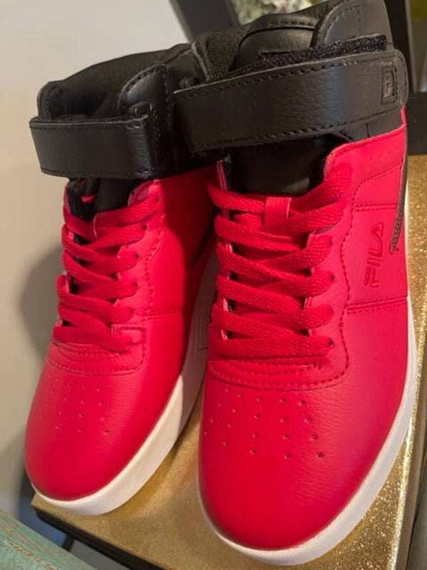 Black and Red Hightop Fila sneakers size 5. New. Velcro on top of sneaker with red laces.
