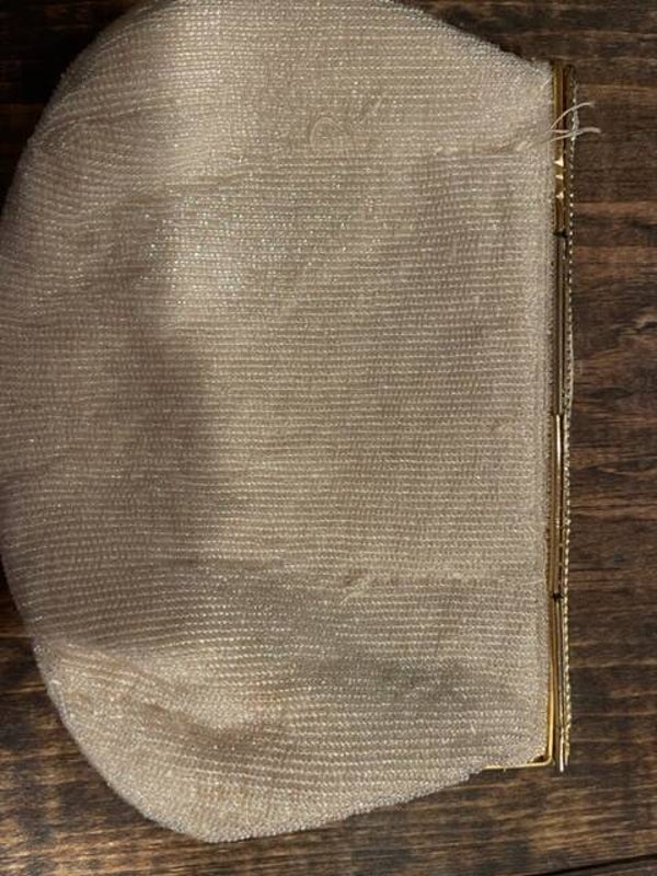 White Saks Fifth Avenue Cluth. Beaded with golden clasp. (2 strings of Beads in back are broken)