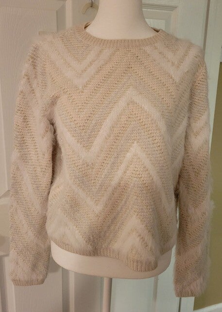 Beige and white fuzzy sweater in Size small. Zig Zag pattern. Great condition and very cute. Compared to $28 onother sites. Size Small