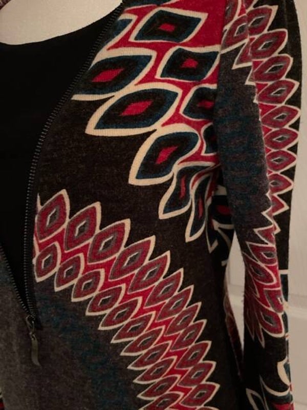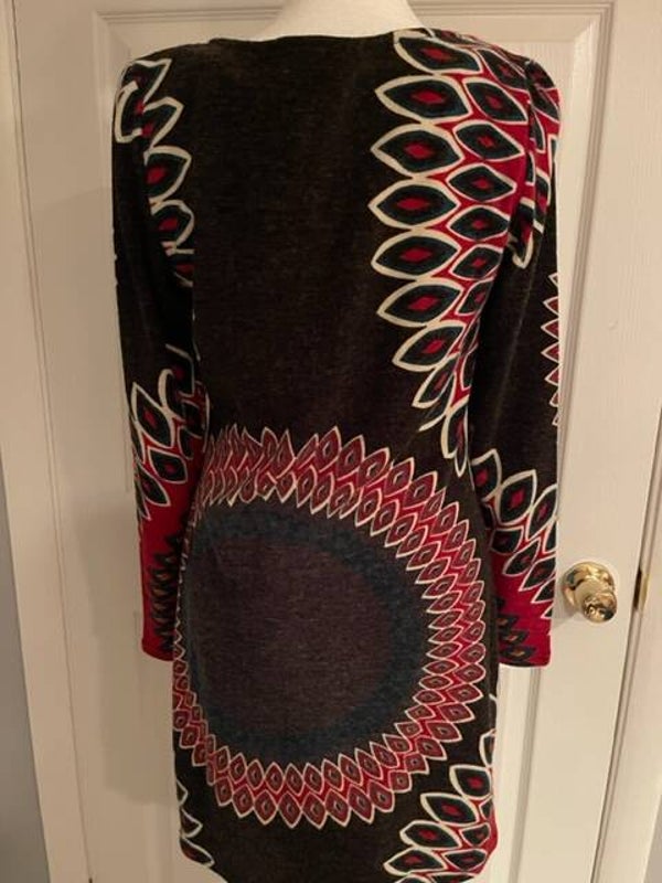 Patterned multicolor sweater dress. Long sleeve. Zipper in front. Unique. Size small.