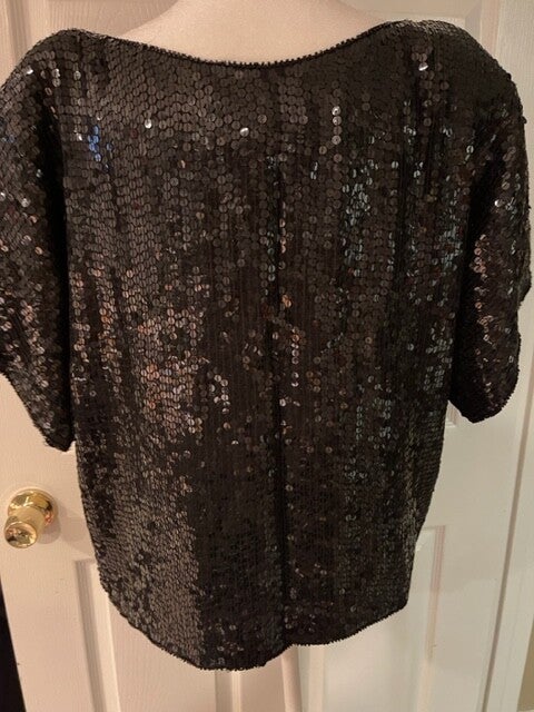 Black and silver seqiun and beaded short sleeve blouse. Size XL. Very Glamorous.